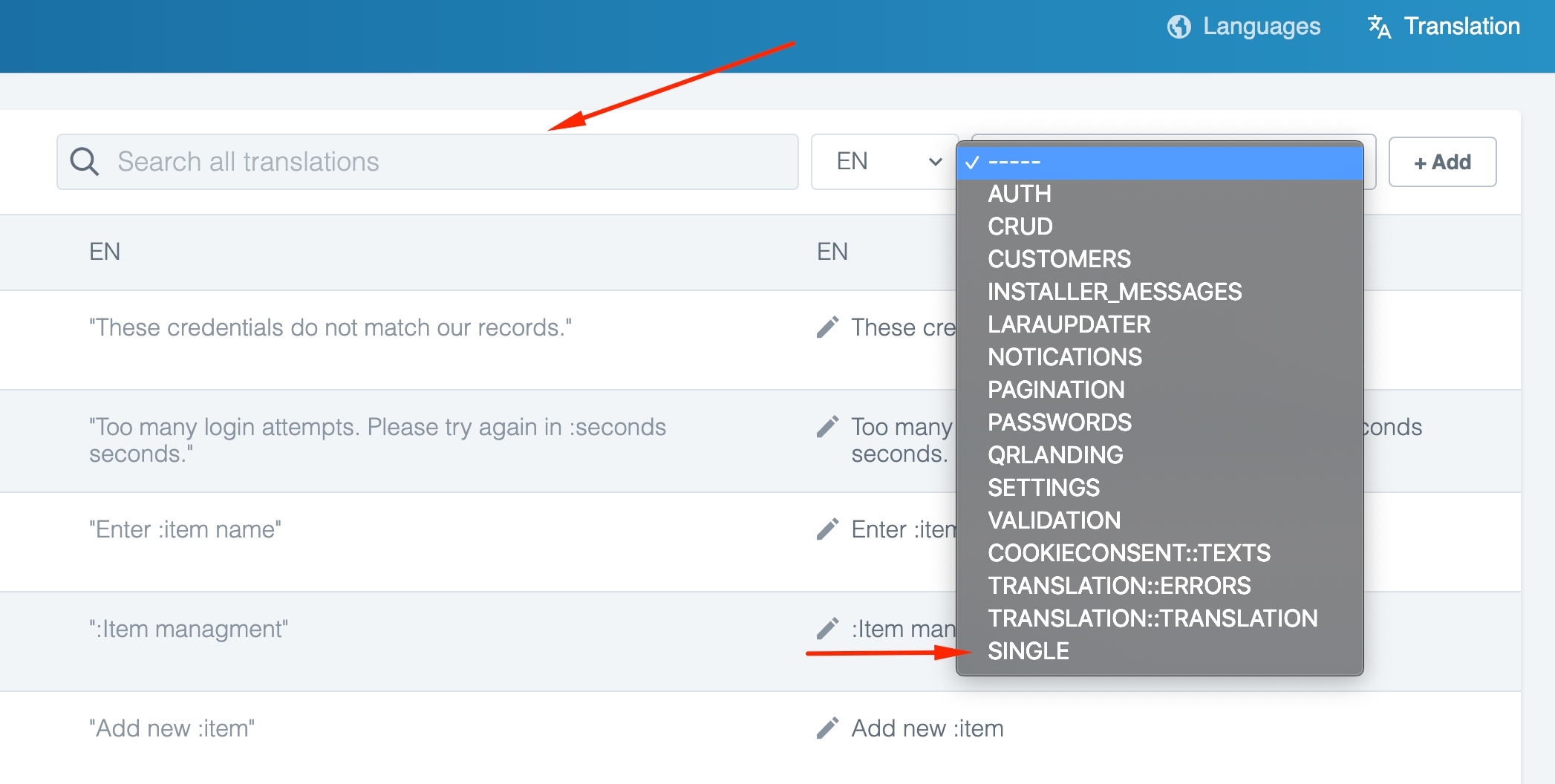 There, the translations strings are grouped, or if not grouped they are in Single ( Single strings ). You can also use the search box to quickly found the string. Select the language you want to translate to.