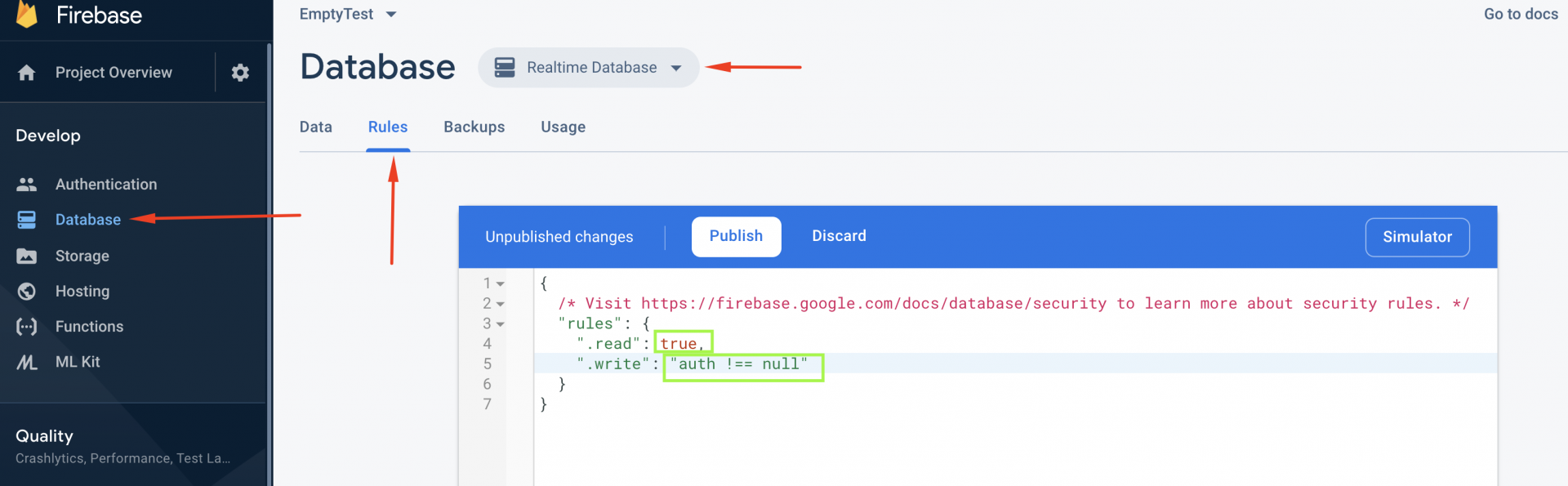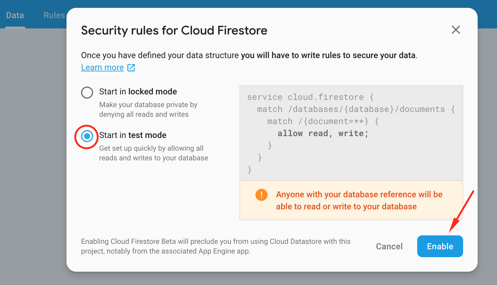 After clicking on the button it should appear a window that will ask you about security rules. Click on the Start in test mode and after that click Enable.