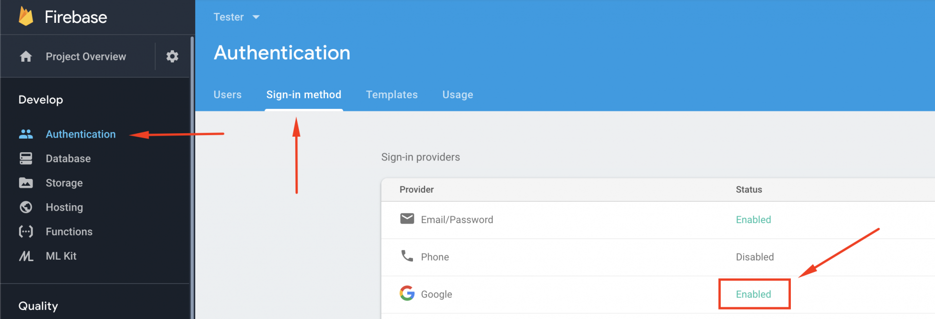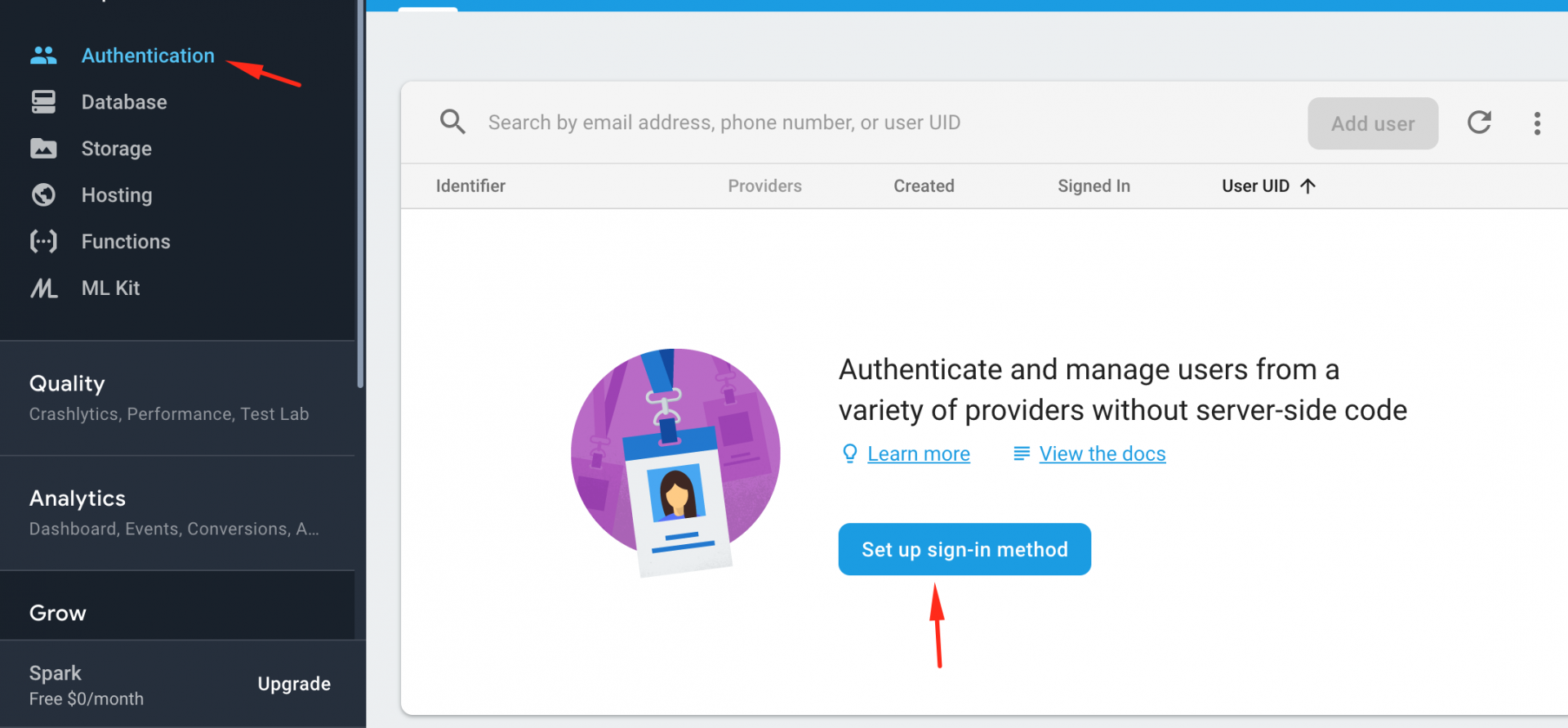 Go into firebase console and click on Authentication and after that click on Set up sign-in method