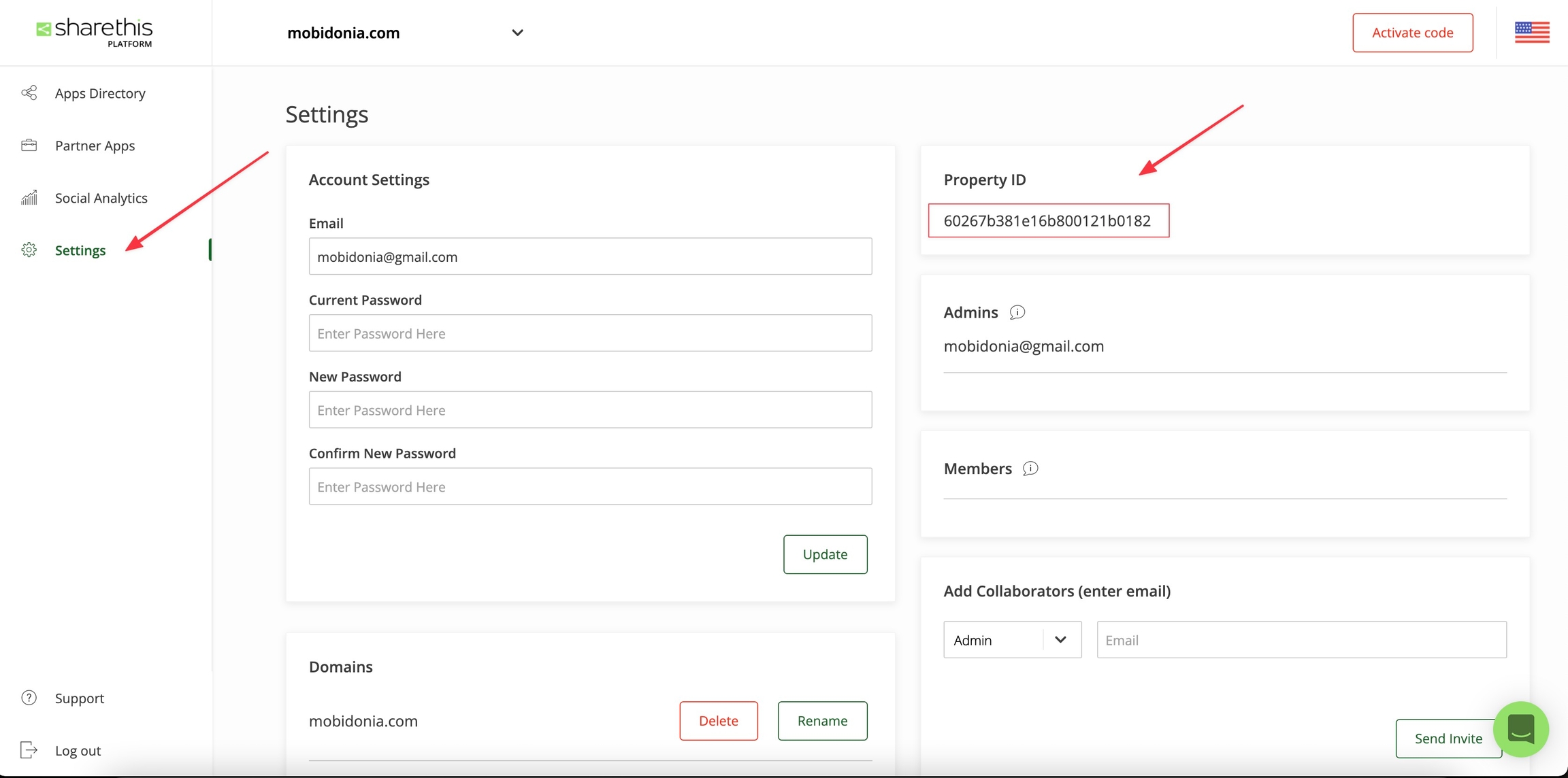 After you finish with the customization from the left menu select Settings and find your Property ID.